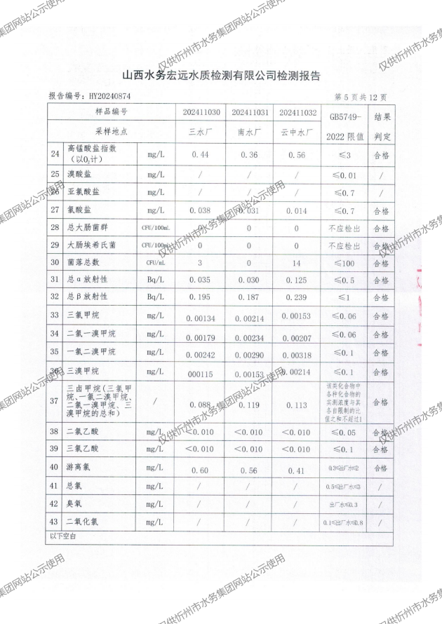 忻州城區(qū)公共供水水源水、出廠水、管網(wǎng)水、管網(wǎng)末梢水2024年11月份水質(zhì)信息公示