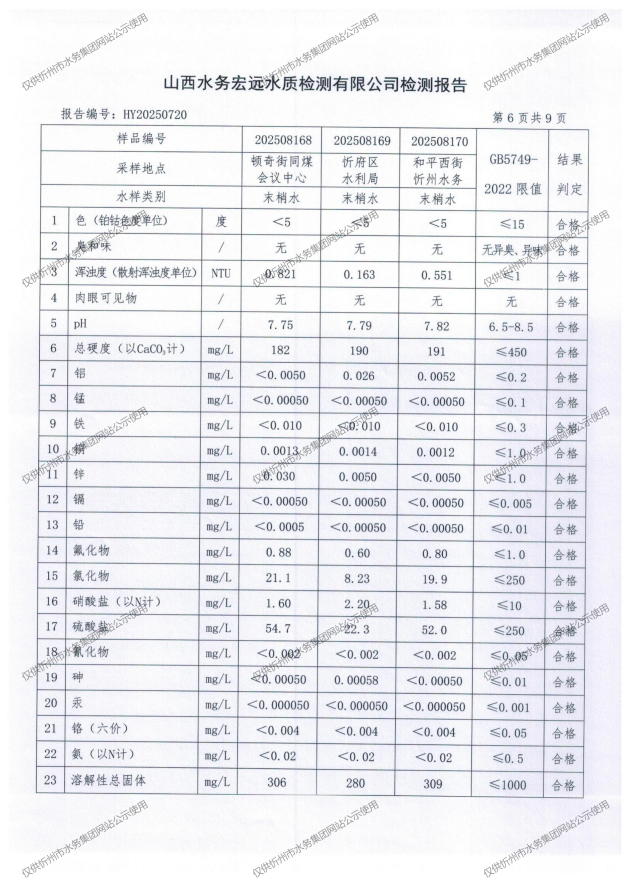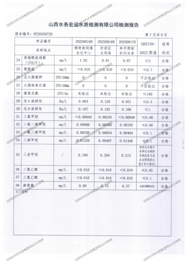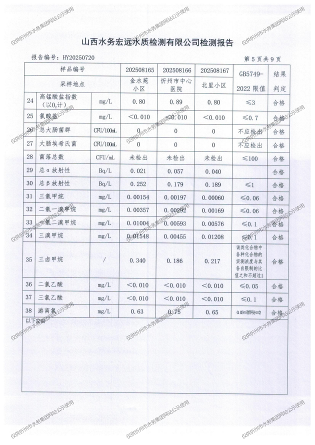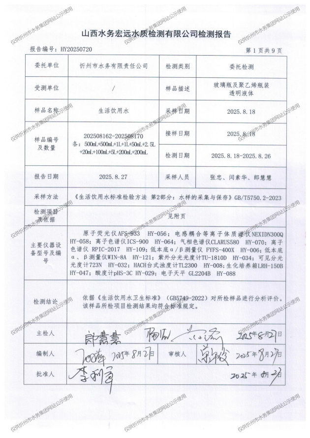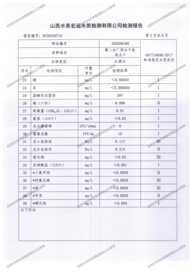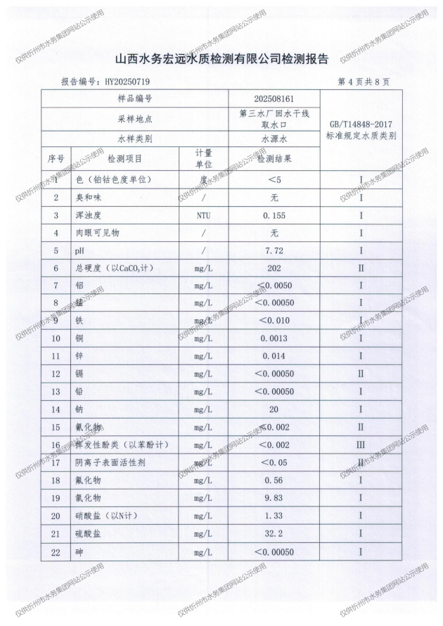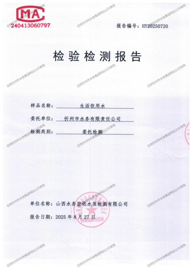 忻州城區(qū)公共供水水源水、出廠水、管網(wǎng)水、管網(wǎng)末梢水2025年8月份水質(zhì)信息公示