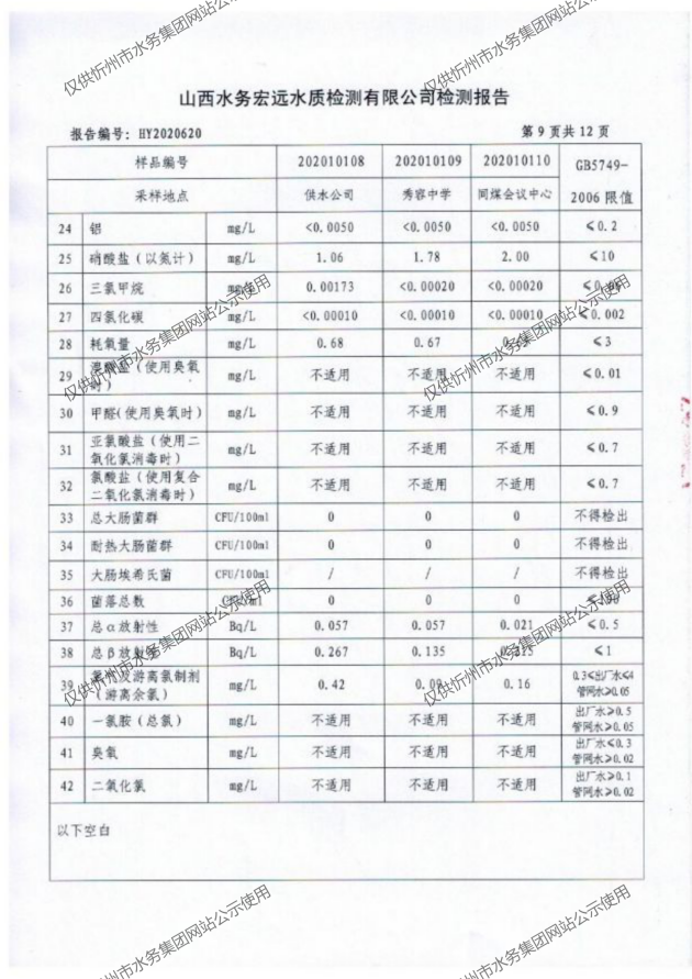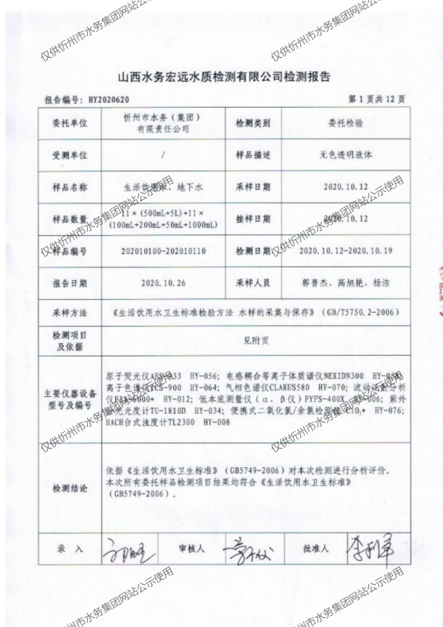 忻州城區(qū)公共供水水源水、出廠水、管網(wǎng)水、管網(wǎng)末梢水2020年10月份水質(zhì)信息公示