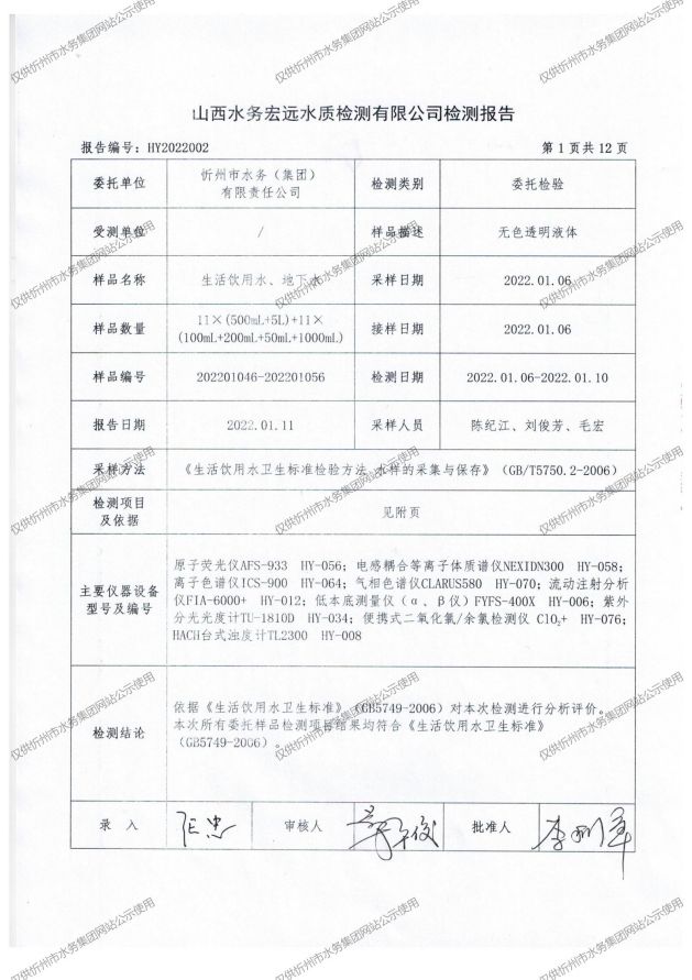 忻州城區(qū)公共供水水源水、出廠水、管網(wǎng)水、管網(wǎng)末梢水2022年1月份水質(zhì)信息公示